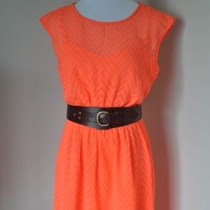 A feminine dress in light, airy chiffon with a flattering nipped waist and a sheer illusion neckline. The subtle zigzag pattern is created with textured clip dots—basically, how grown-ups do swiss-dots.