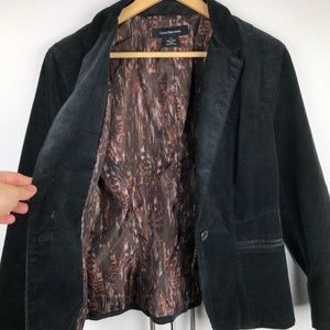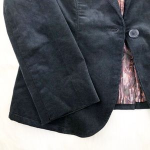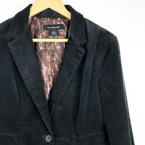 Calvin Klein blazer. Fine corduroy. Fully lined. Single button front. Faux pockets in front. Shell 99% Cotton / 1% Elastane. Lining 100% Polyester.