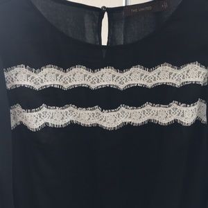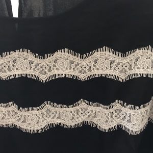 Super fun black silky blouse with beautiful cream eyelash lace detailing.