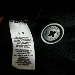 Navy blue fleece line hoodie with plaid lined hood. No stains or tears plus comes with extra button (shown in pics)