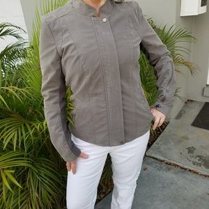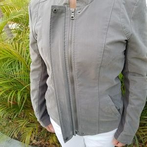 NEVER WORN. In perfect condition. Brand new, suade, green Tribal jacket. Cotten on the sides and sleeves. There is a button on the top and bottom to conceal the zipper. I love this jacket, the only reason I'm selling is because it's a little too big for me :( The size says it's a small but it fits like a 6.
