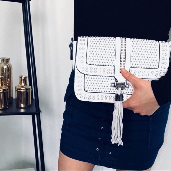 Mini but spacious crossbody bag in white. Covered in polished studs with tassel detail for a beautiful and unique design. Long strap is removable and bag can be used as a clutch.