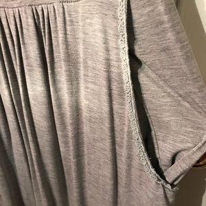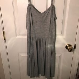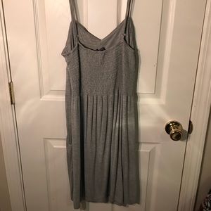 Super slouchy, soft grey dress with fun and cute detail around the pockets! The straps are adjustable and can be fixed to fit just about anyone!