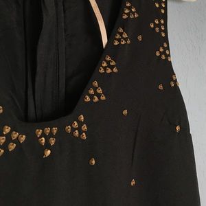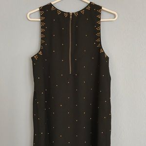Black studded shift dress. Exposed back zipper. Lined. 100% polyester. Hand wash cold, line dry. Wear with a hat and sandals for a casual summer day or with booties and a jacket for your favorite concert!
