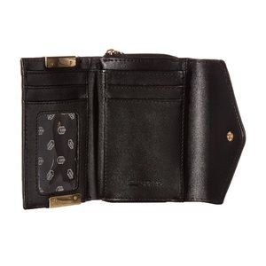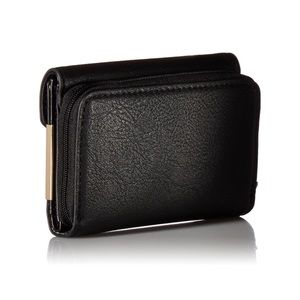This chic, brass accented, envelope style, trifold wallet is compact enough for any bag, but can hold everything you need. Zippered coin compartment, card slots, cash compartment, clear ID slot. Classic black faux leather matches any bag or outfit.