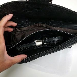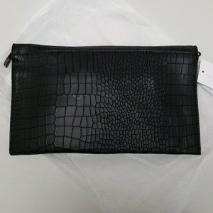 Super cute! (Large Size)Smooth faux leather, Black Clutch with shoulder and wrist strap, 2 additional zipper sections. It's stylish and sleek details are great for spicing up your look. This is a Great option to switch up the traditional handbag. Also plenty of space for your things. This is made very well!! Great Quality!
