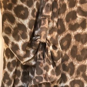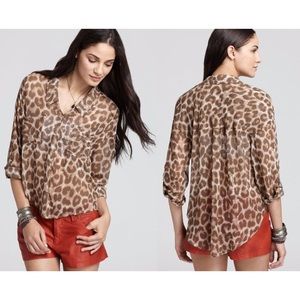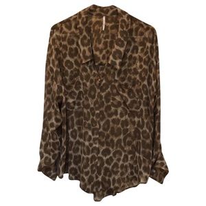 Free People animal print semi-sheer button down Blouse features long sleeves that have adjustable tab button cuffs to keep them 3/4 up, collar, two front chest pockets, five button down closure, all over animal print leopard/cheetah. Condition like new