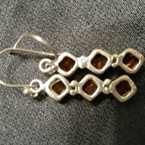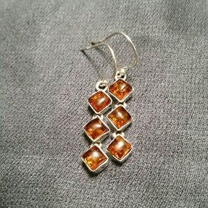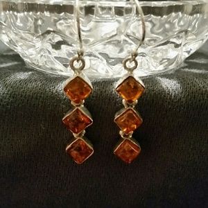 Three diamond-shaped Amber pieces set en Pointe for a long, elegant, modern look. The Amber is a beautiful warm brown and all the pieces match. Set in solid Sterling Silver with French hooks. A lovely look for everyday or to wear with a special outfit.