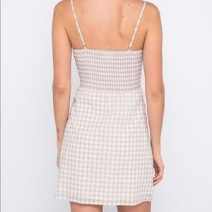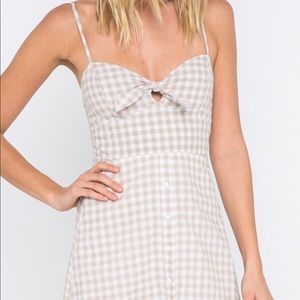 New arrival for spring/summer! Gingham print dress with tie front and button up skirt. Fully lined, adjustable straps! Available in small, medium, and large. New with tags in original packaging!