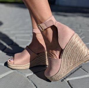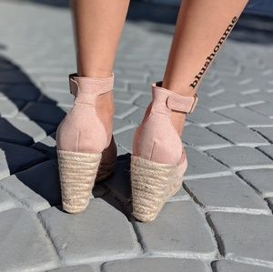 Faux suede, peep toes, strap buckle espadrilles heels - Blush.