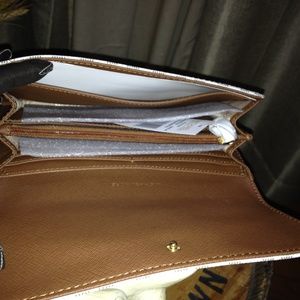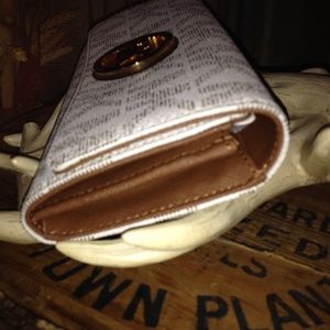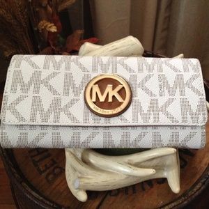 MK Signature PVC & Saffiano Leather Silver tone hardware, Front Flap with gold MK logo medallion snap closure. Exterior slip pocket at back. Inside; 2 full length compartments, zipped pocket divider with leather pull, 10 card slots, & 2 multipurpose slip pocket one at front wall and the other at back wall. MK signature logo material and saffiano leather lining.