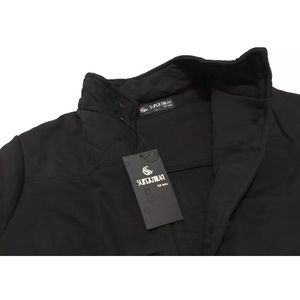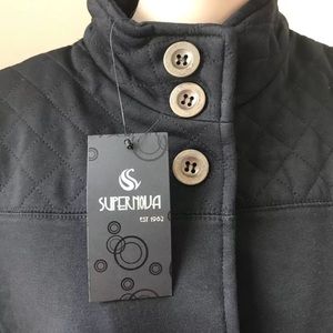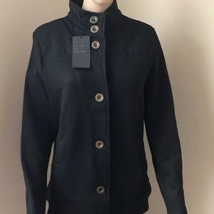 This jacket has a quilted pattern on the top front and back. It also has big brown buttons. Also has pockets up front (hard to see in photos).