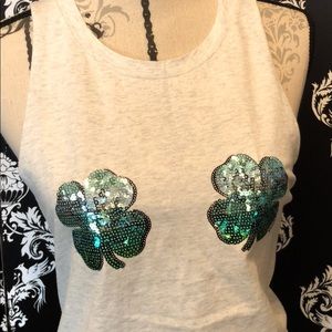 Super cute Victoria’s Secret tank with sparkly sequin ombré colored four leaf clover! Add a little extra fun to your St. Patrick’s day with this super fun tank! Brand new with tags...Smoke free home. Size small fits like a medium.