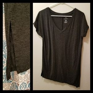Gray asym. loose fit Vanity T-shirt, worn once, bought last spring. Buttery soft material, V-neck with a nice relaxed fit that gently sits on your curves. The bottom sides are split and there is a little folded cuff on the sleeves. Very smooth and comfy material with a lot of stretch if needed. Let me know if you need more photos or have questions! Open to offers β€