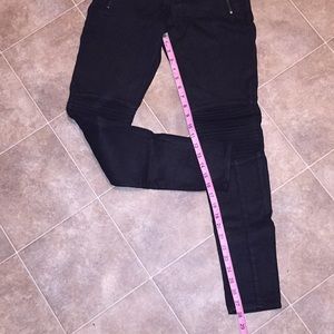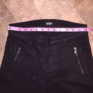 Black Hudson jeans with knee details and front zipper detail. Jeans have a slight shine to them. The paint on the zippers are worn. Great quality jeans.