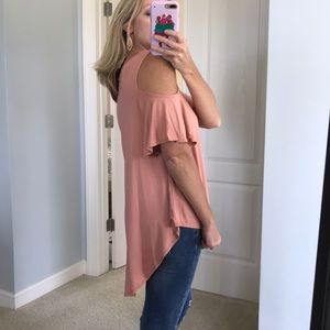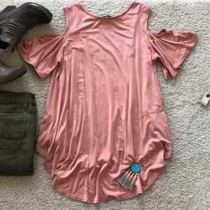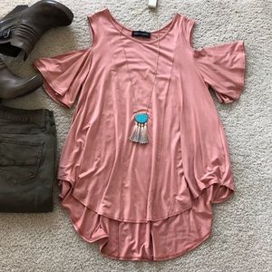 Cold Shoulder Tunic Top. Gorgeous apricot color. Rounded neckline. Cold shoulder with short flutter sleeves. Hi lo styling. 95 viscose 5 Lycra.