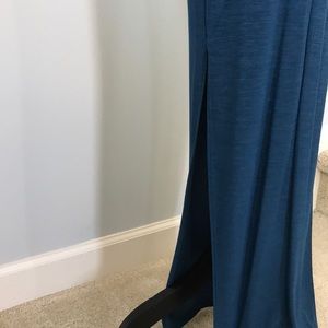 Teal Maxi Dress. Gorgeous dress for that formal summer event. Spaghetti straps. Low neckline with open back. Ties at the back of the neck. Side slits. 95 polyester 5 spandex.