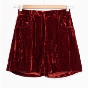 Crushed Velvet burgundy shorts. Stock images for style inspiration. Pictures of actual shorts and stock images of shorts from AOS website. US 12/EUR 42. Waist is 16” and waist to hem is 16.5”. H&M (cooler) sister brand