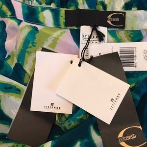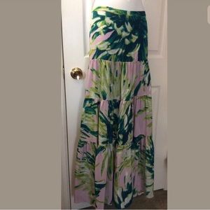 Just ROBERTO CAVALLI Maxi Skirt. It has a silk green, lilac purple, green teal & white floral material, is un-lined, side zip closure and a tiered style. Looks stunning with a white tank top and statement necklace!!! New with tags $1,070!