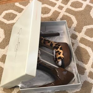 Leopard/Patent Leather Peep Toe 5” Platform Heels
