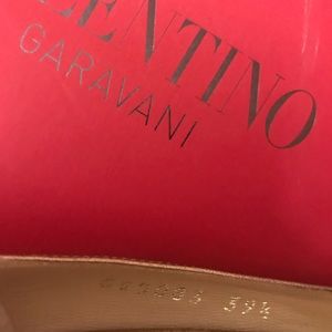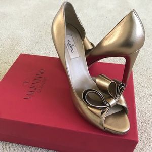 Authentic ...The gorgeous Valentino D Orsay couture bow heel in 39.5 is a pretty matte gold closest to color in second picture Worn once by my daughter to her Wedding rehearsal dinner.! Valentino dust bag and box included. Heel height approximately 5”