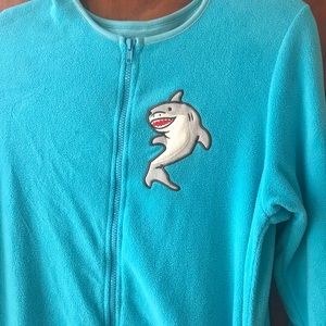 This garment is a dream come true if you love footie pajamas for adults, delightful shark appliqués, comfy fabrics, and having your feet come to life as smiling sharks! It zips in the front and is a very roomy size Small.