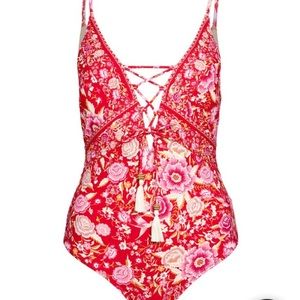 BRAND NEW with TAGS!! Bright, femme florals adorn this beautiful one piece swimsuit with a deep plunging, lace-up style neckline. Adjustable spaghetti straps. Lined and padded. 83% nylon, 17% Elastane. Color: Flame.