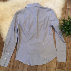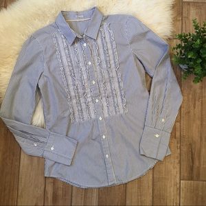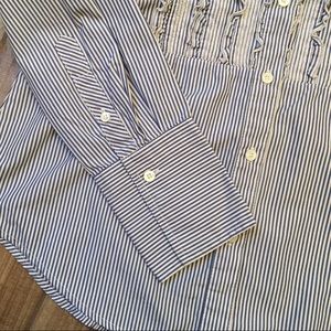 Blue and white striped button down with ruffled tuxedo front from J. Crew. 100% cotton, shell buttons. Excellent preowned condition! The size tag is cut off, but based on measurements it’s a size 2-4. It matches up perfectly with another size 4 J. Crew button down I have.