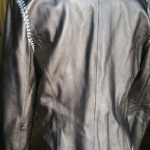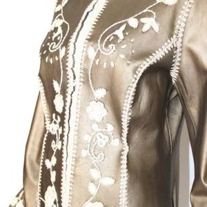 SOFT & SUBTLE LEATHER JACKET BY OSCAR DE LA RENTA. THIS AMAZING LEATHER JACKET HAS A "MATTE-GOLDEN-BRONZE METALLIC" FINISH. FEATURES CREAM CROCHET FLOWERS & TRIM ACCENTED WITH METALLIC THREAD. CLOSES AT THE FRONT WITH A HOOK/EYE SET. FULLY LINED.THIS JACKET LOOKS FABULOUS WITH DENIM FOR A RELAXED YET POLISHED LOOK OR OVER A SIMPLE SHEATH.