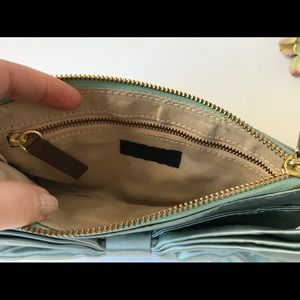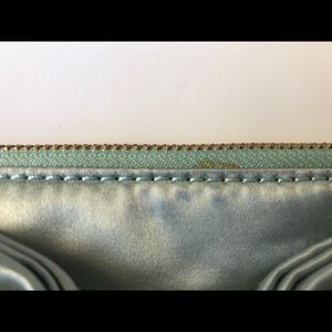 Gorgeous baby blue satin clutch with bow detail. Interior zip pocket. Small rust blemish near zipper (see photo). Gently used.