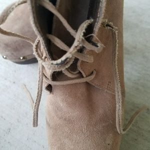 Soft, brown suede, lace up, gold studded ankle booties. 5.5" heel. Laces a bit worn, see picture. Gently used in good condition.