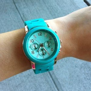 This is a super cute turquoise watch with gold accents in a perfect color for spring! The band can be adjusted to fit your wrist by having the links removed.