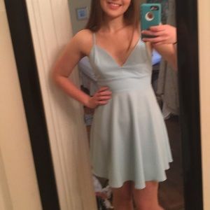 Freshly dry cleaned, only worn once! Super flattering skater style pale blue dress from a small boutique label. I got SO many compliments on this dress, it’s the perfect Cinderella dress color. Would fit small or medium with an adjustable sash tying in the back. 27” waist, 23” from front V to bottom of the skirt.