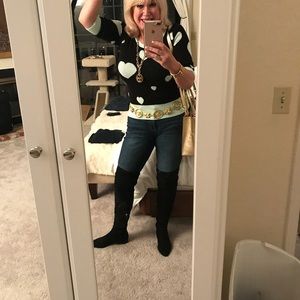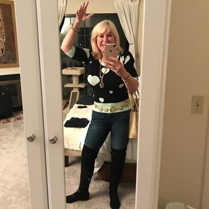 🔴EUC celebrate Valentine’s Day or Month with kish and whimsy in this fun, adorable sweater. Black with mint green hearts and trim. Made of soft fibers: cotton, viscose & nylon. Size S/M but has give (I’m NOT small in this pic, lol!). I love the fit and feel. REMAIN a repeat or new fan of this fun designer label. Always a “Smoke Free” Home! THANKS FOR SHOPPING!