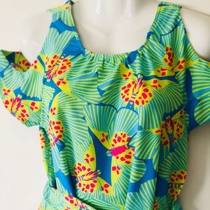 Cold shoulder, keyhole back, scoop neckline, goes on like a sheath dress-sash turns it into fit n flare!