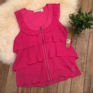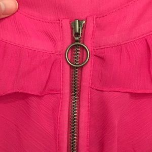 Floaty layered top with exposed zipper in a pink crinkled chiffon. 100% polyester. NWT but one tiny spot on front.