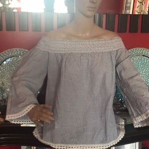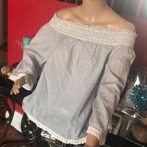 🛍Blue and white 100% Rayon three quarter off the shoulder sleeves shirt 👚. Time to de clutter.🛍 Worn once from my closet.🛍
