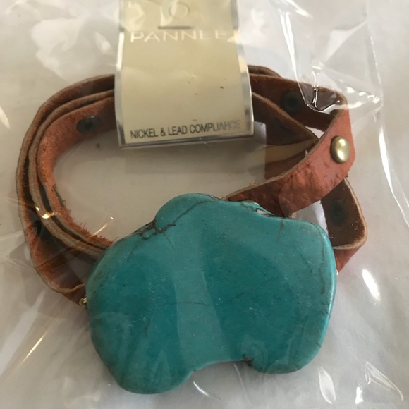 Adorable turquoise colored marble stone and distressed faux leather studded wrap bracelet. Snap closure and has an extra snap to make it adjustable. 21” overall length with 1 inch adjuster. Picture 1 is the stock photo. Pictures 2-5 show the different shaped stones that are available. Choose from the four bracelets shown.