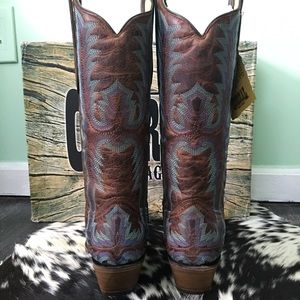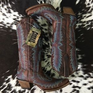 Corral LD Cognac Blue-Turquoise Full Stitch Western Snip Toe Cowboy Boots. Great for Festivals, Rodeos, Weddings, Or Concerts. These boots are brand new in the box, & still have the plastic & boot inserts inside. Have only been opened for photos. So still smells strong of leather! Features a 12'' shaft, scalloped collar and leather pull straps, genuine cowhide leather! If you are unsure about sizing, please contact before purchasing
