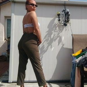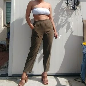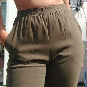 These cigarette pants are an elastic waist and have a slight contrast stitch. The pockets are huge but lay flat. I love the fit, the color and length(26 in L, 26 in waist, 12 in rise)