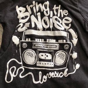 ⭐️final price⭐️Love sick threads hooded tee shirt “bring the noise” black with white print. Clean smoke free home. Size 6m excellent condition