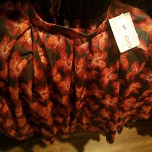 Black/brown base with reddish Hawaiian type flowers. Box pleats and pockets.