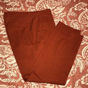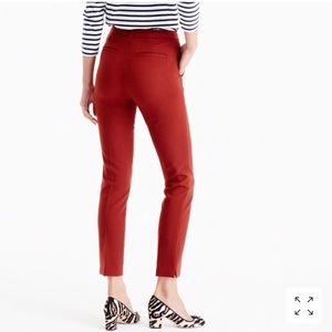 These pants sits just above hips. Fitted through hip and thigh with a slim, cropped leg. Slant pockets, back welt pockets. Side zipper. Cotton/viscose/elastane. New with tags. I have size 6 and size 10 . Color is close to burnt orange.