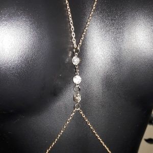 Gorgeous and delicate gold tone body chain that clasps with a claw clasp at the neck and back/waist. Top part adjustable to 28" bottom part 42".