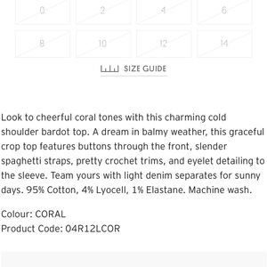Brand new with tags Topshop Coral Crochet Button Up Crop Top. Such a cute top! Available in Large ( sz 8) and Medium (Sz6).