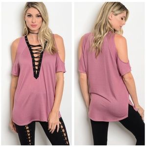 🎀1 SM LEFT🎀 Cold Shoulder Mauve Lace Up Top