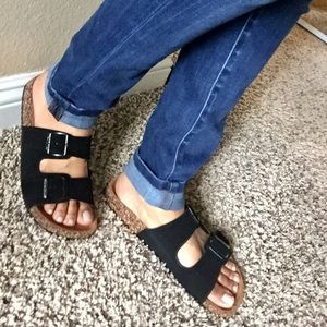 Faux suede 1.5” Heel lug sole double bands slip on for easy wear. Inspired by Birkenstock !!!! 1 size small so please order up! All man made materials.