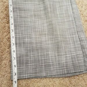 Light grey/white dress pants, front pockets at hips, back pockets, front hidden button and metal tab closure