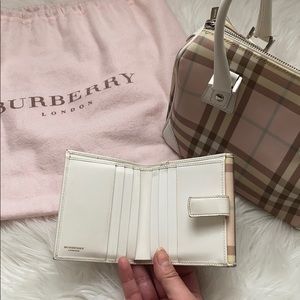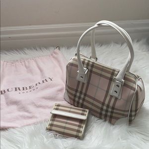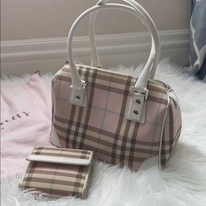 Good Condition Pink & White Vintage Burberry speedy handbag and matching wallet. Signs of wear shown in photos.