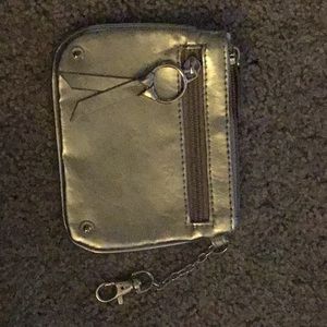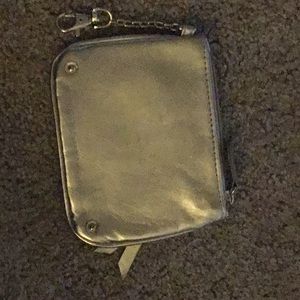This wristlet metalic gold storage that works wherever you need it to. This supple, straightforward wristlet is cute on its own for a night out or, with the wrist strap detached, as a roomy wallet inside your work bag. Measurements are height 4.25 by 5.5 wide. In very good shape and very cute.